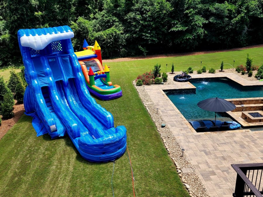 Double the thrill with our two-lane Blue Thriller Waterslide. The bright blue color of this mighty inflatable water slide is perfect for both kids and adults. The two separate sliding lanes allow two participants to enjoy racing each other on the super long 35 feet slide. Designed to maximize fun and safety, this waterslide comes with a finger-safe net on the top platform and features soft inflated edges, a landing platform, and an easy-access ladder.
