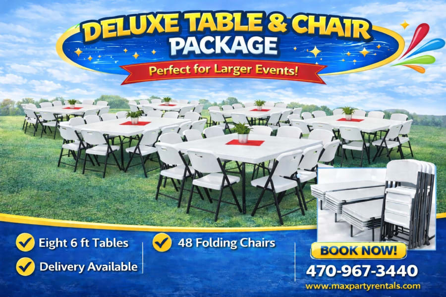 Book the Deluxe 8 Tables and 48 Chairs (6 ft tables) package today and secure a polished setup for your next event. Contact us for quotes, availability, and add-ons. 📅🪑